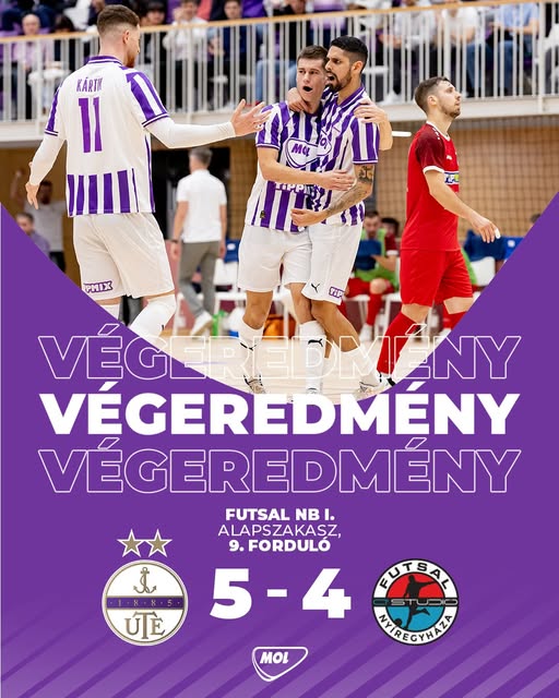 Remek iramú, fordulatos és parázs hangulatú mérkőzésen az UTE játékosai hazai pályán 5–4-re legyőzték az addig veretlen Á Stúdió Futsal Nyíregyházát az NB I alapszakasz 9. fordulójában.