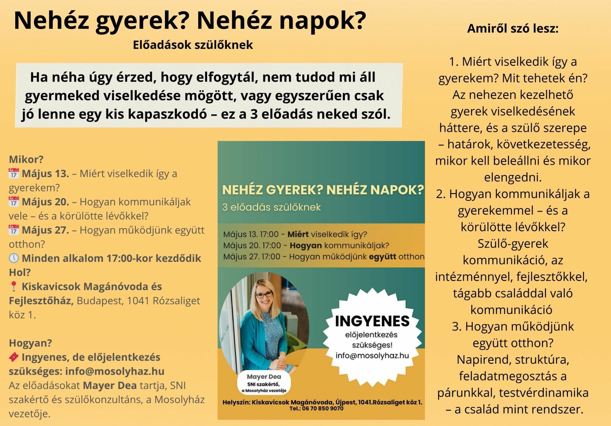 A május 13-án induló, háromrészes előadás-sorozat helyszíne a Kiskavicsok Magánóvoda és Fejlesztőház, az előadásokat pedig Mayer Dea SNI-szakértő, a Mosolyház vezetője tartja.