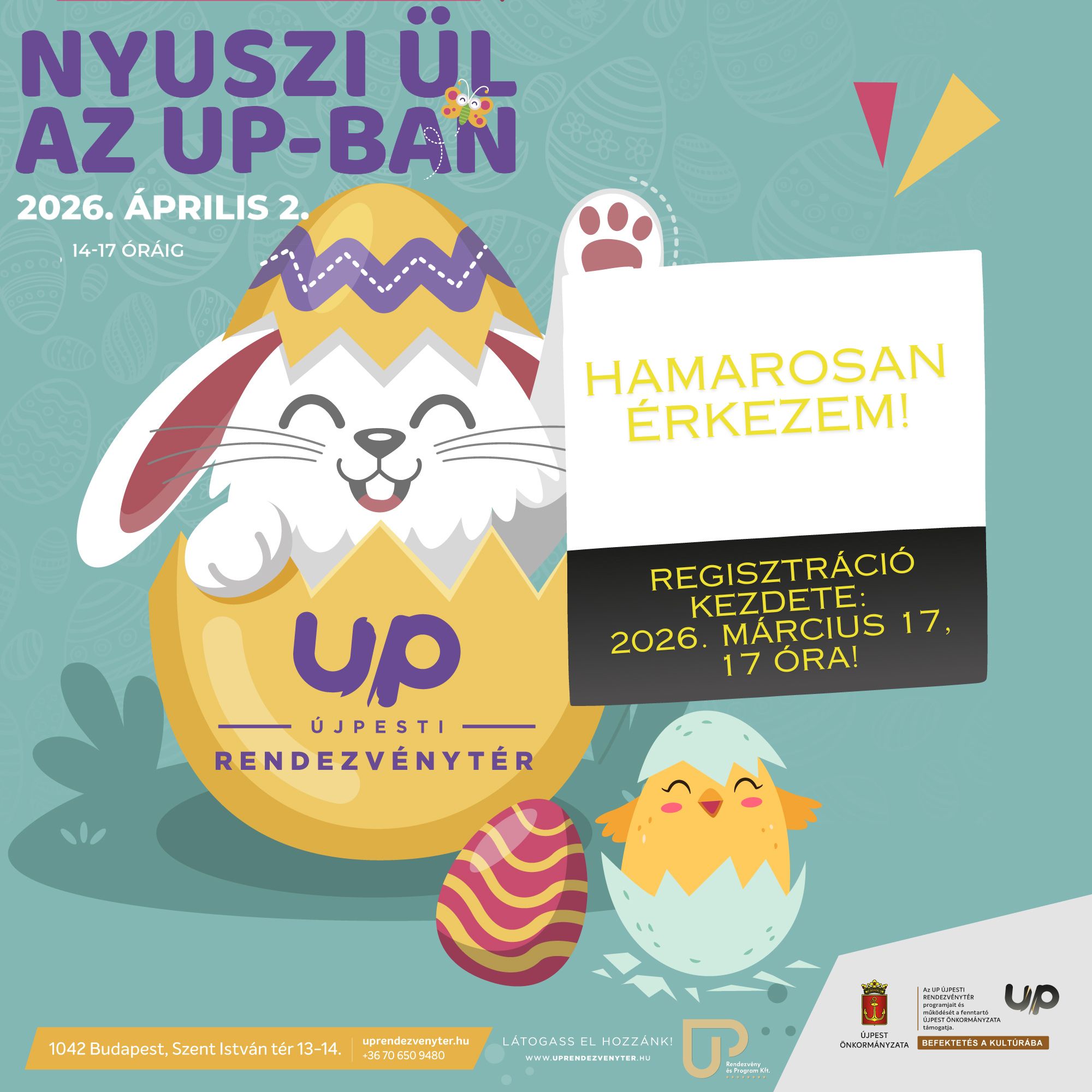 A „Nyuszi ül az UP-ban!” program keretében a gyerekeket és családjaikat egy vidám, tavaszi délutánra várják a szervezők. A rendezvényen való részvétel regisztrációhoz kötött, a regisztráció kezdete: 2026. március 17-én 17 óra.