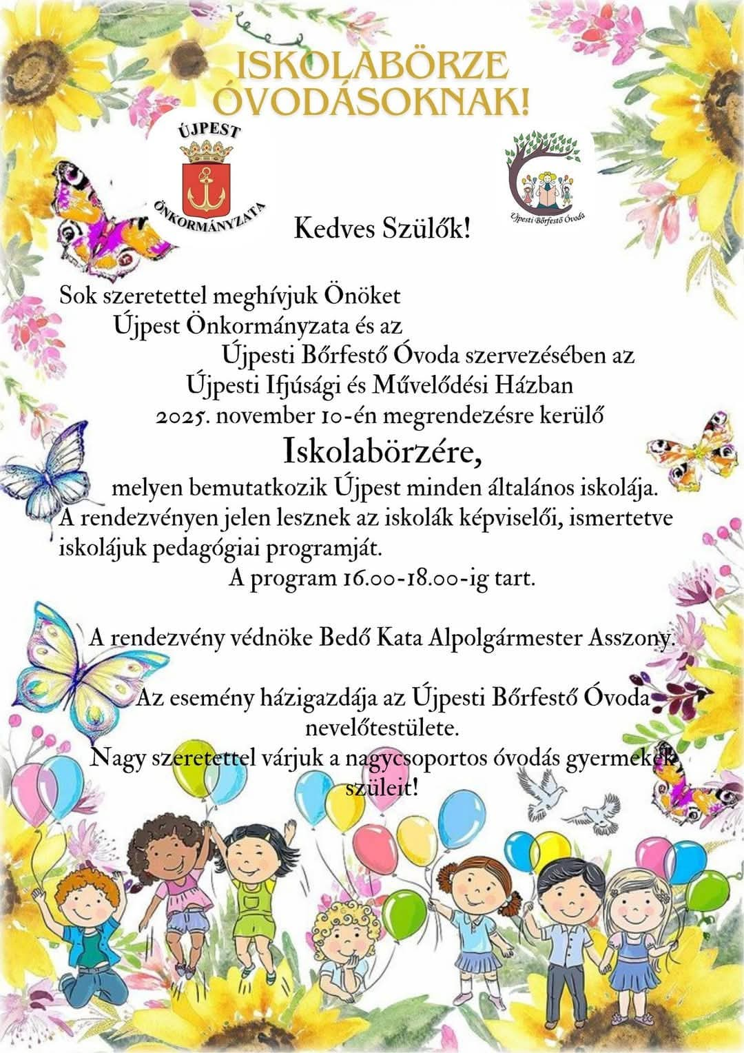Újpest Önkormányzata és az Újpesti Bőrfestő Óvoda szeretettel várja a nagycsoportos óvodás gyermekeket és szüleit az „Iskolabörze óvodásoknak” című rendezvényre, amelyet 2025. november 10-én, 16:00–18:00 óra között tartanak Újpesten az Ifjúsági Házban.
