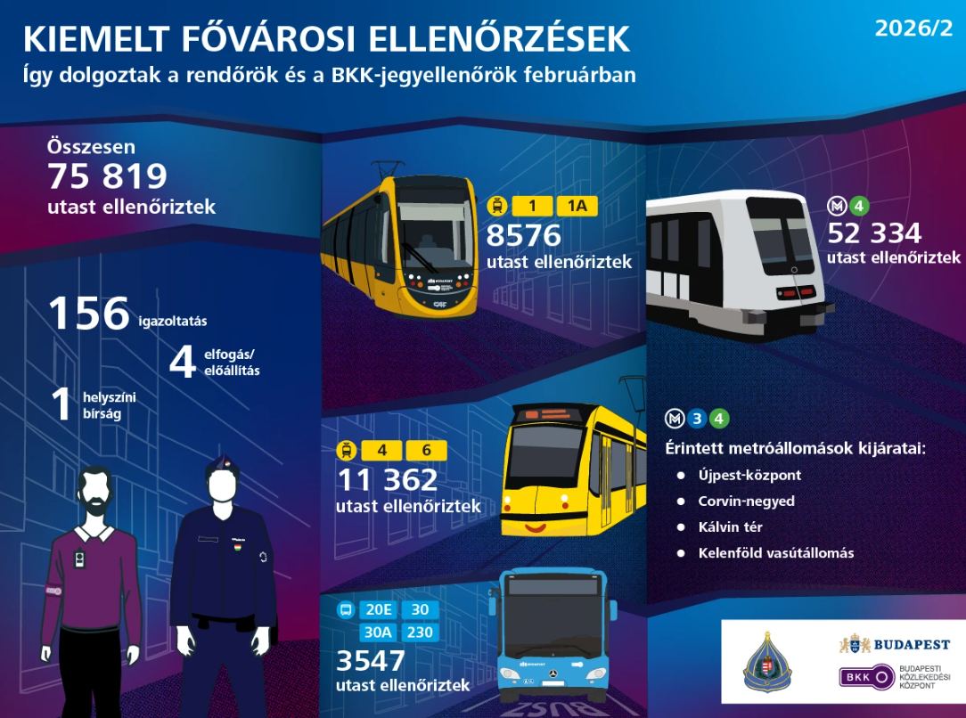 Több mint 75 ezer utast ellenőriztek februárban a főváros forgalmas közösségi közlekedési csomópontjain. Az akció egyik kiemelt helyszíne Újpest-központ volt. Az ellenőrzéseket a Budapesti Rendőr-főkapitányság, a Budapesti Közlekedési Központ jegyellenőrei, valamint a FÖRI rendészei összehangolt akciók keretében végezték.