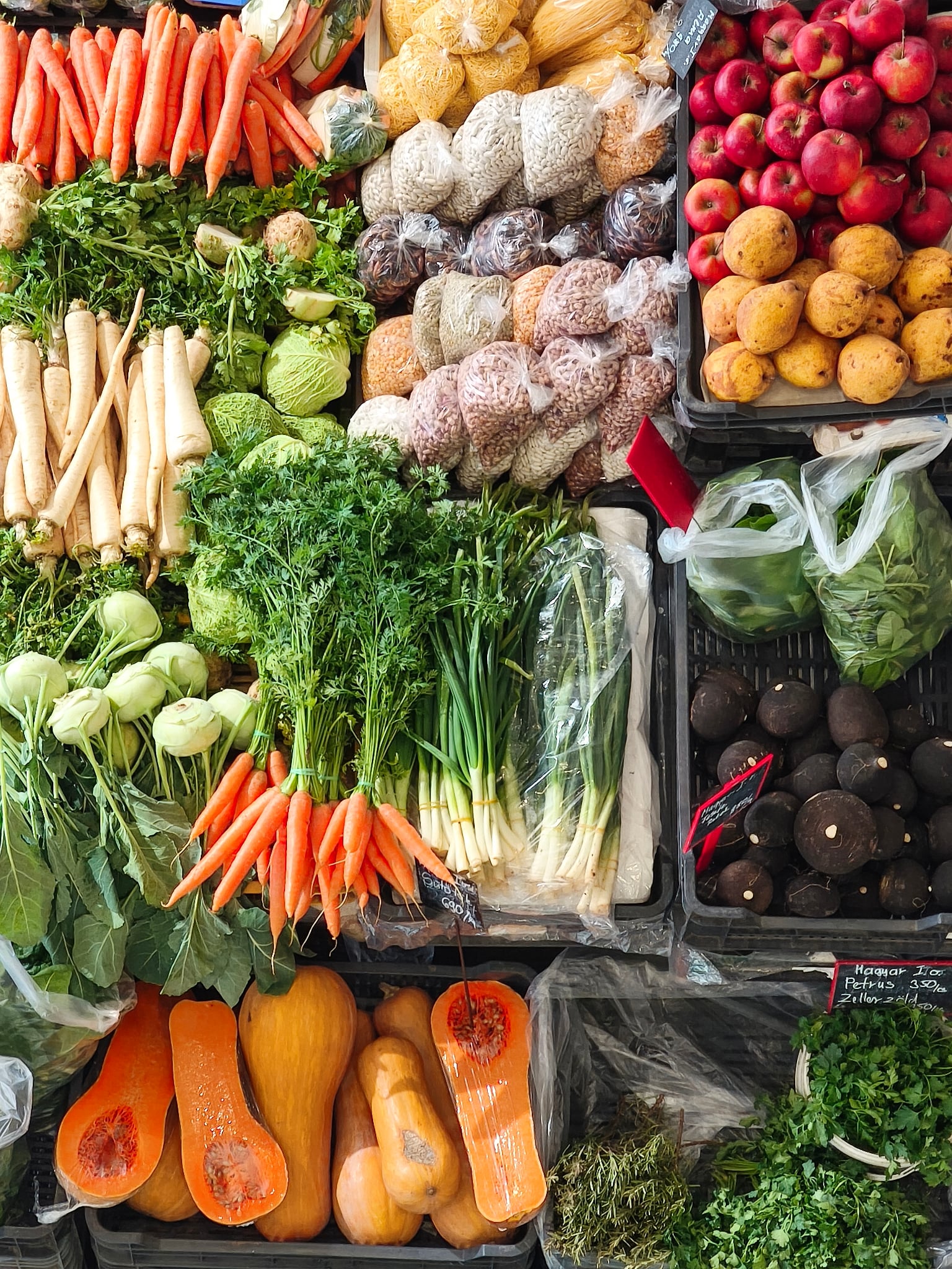 Zöldségből is bőséges a választék az újpesti piacon, a cukkini ára 1500 Ft/kg, karfiolt már 299 Ft/kg-os áron találunk, a fejes káposzta ára kilónként 300 és 480 Ft között mozog, a lila káposzta kilója 480 Ft-ba kerül, a kelkáposzta kilójáért pedig van, ahol 599 forintot, és van, ahol 980 forintot kérnek. Tehát érdemes szétnézni! A sárgarépa ára 400 Ft/kg, a gyökéré pedig 990 Ft/kg.