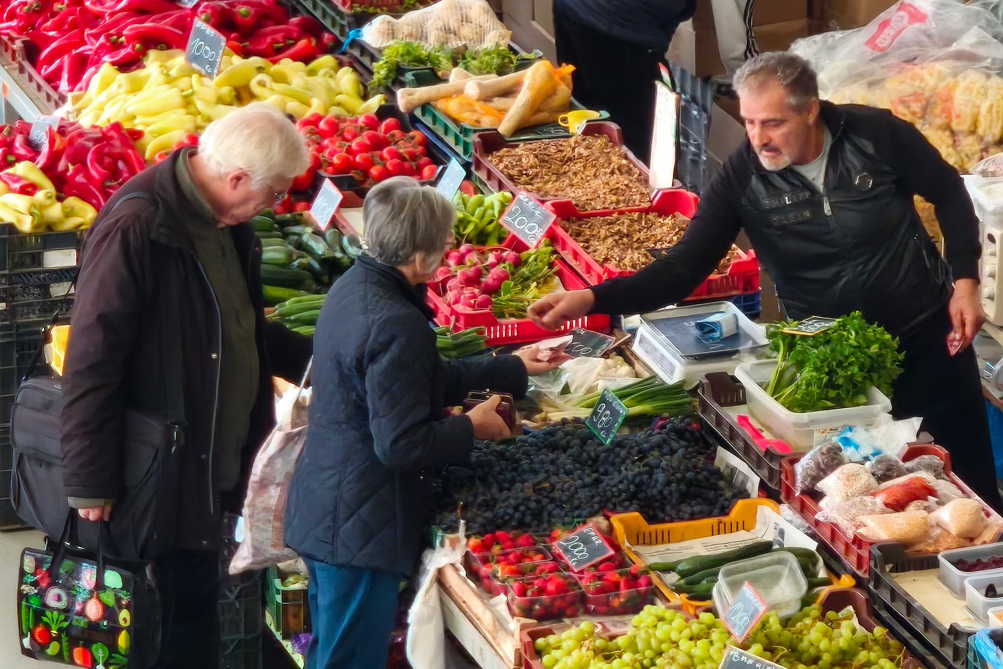 Péntek reggel a tejtermékeket kínáló pultoknál hosszú sorok kígyóznak. Nem véletlenül. Szemet gyönyörködtető és illatos a parenyica sajt, ez a félkemény, félzsíros, füstölt juhsajt, és igazi különlegesség a parenyica rolád. Mindkettő ára 6800 Ft/kg. Sokan üres üvegekkel várakoznak, friss tejért jöttek, amiből 600 forintért vihetnek haza egy litert.
