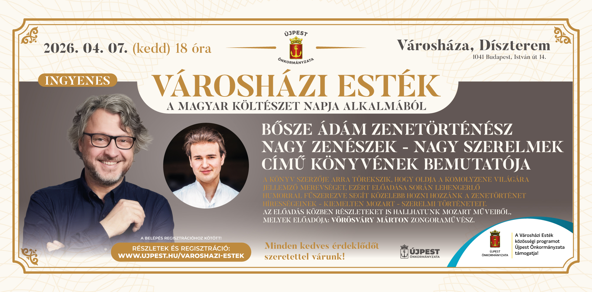 2026. április 7-én, kedden Bősze Ádám zenetörténész „Nagy Zenészek – Nagy Szerelmek” – című könyvbemutatójának ad otthont a Városháza díszterme, amely bemutató közben az érdeklődők Mozart műveiből is hallhatnak részleteket Vörösváry Márton zongoraművész előadásában.